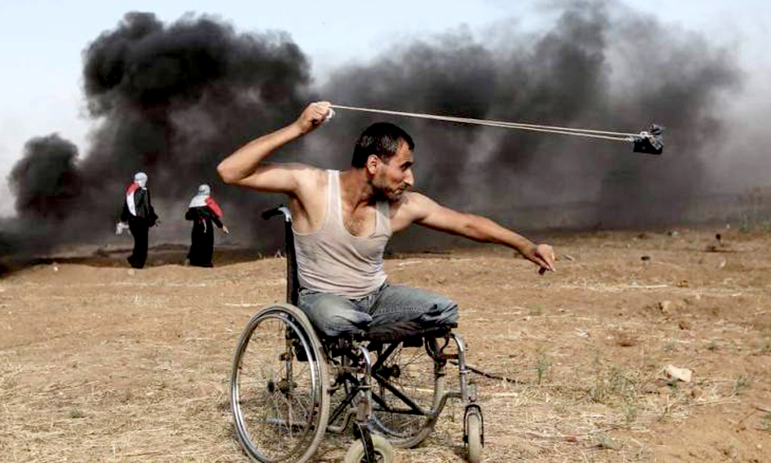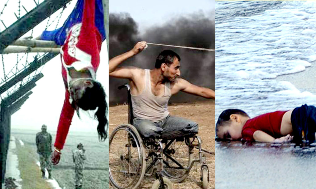 ১৫ মে ২০১৮, পেছনে কালো ধোঁয়া। নীচে খা খা মাঠ। সামনে কাঁটাতার। রশি’তে পাথর বেঁধে ঘোরাচ্ছে ফাদি আবু সালাহ। লক্ষ্য ইসরায়েল। হুইল চেয়ারের এই সৈনিক এক স্বাধীনতাকামী ফিলিস্তিনি। ২০০৮ সালে গাজায় বোমা হামলার বিরুদ্ধে বিক্ষোভে যোগ দিয়ে ইসরায়েলি বাহিনীর গুলিতে দু’পা হারান তিনি। ১৫ মে ছিল ফিলিস্তিনিদের নকবা দিবস। সেদিন জেরুজালেমে মার্কিন দূতাবাস স্থানান্তরের প্রতিবাদে জড়ো হয় প্রায় পঞ্চাশ হাজার ফিলিস্তিনি। শান্তিপূর্ণ সে আন্দোলনে সকাল থেকেই হুইল চেয়ারে হাজির হন সালাহ। ইসরায়েলি বাহিনী নির্বিচারে গুলি চালায়। নিহত হন সালাহ। নিহত হওয়ার আগে অপ্রতিরোধ্য এই সৈনিকের যুদ্ধরত ছবিটিই আমাদের জানান দিয়ে গেল, আমরা ভালো নেই। জানাল, কতটুকু পিঠ দেয়ালে ঠেকে গেলে— দু’পা হারানো একজন মানুষ যোদ্ধা হয়ে ওঠে আর জন্মভূমির জন্য মৃত্যুকে বরণ করে নেয়।