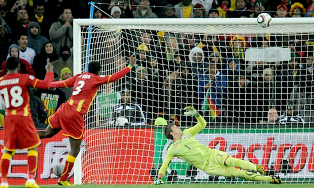 ২০১০ বিশ্বকাপের কোয়ার্টার ফাইনালে ঘানা বনাম উরুগুয়ের ম্যাচে হিরো হতে পারতেন ঘানাইয়ান তারকা আসামোয়াহ জিয়ান! উরুগুয়ের লুইস সুয়ারেজ গোলবারের সামনে গোলকিপার স্টাইলে হাত দিয়ে বল ঠেকিয়ে লাল কার্ড দেখেন। পেনাল্টি পায় ঘানা। নিতে আসেন ক্যারিয়ারে এর আগে একটিও পেনাল্টি মিস না করা জিয়ান। নিয়তির নির্মমতায় বল মারেন বারপোস্টের উপর দিয়ে! জিরো থেকে হিরো বনে যান সুয়ারেজ, আর প্রথমবার পেনাল্টি মিস করে নিজের কাছেই যেন অপরাধী হয়ে উঠেন জিয়ান। তার ওই মিসে কোয়ার্টার ফাইনাল থেকে বাদই পড়ে যায় ঘানা!