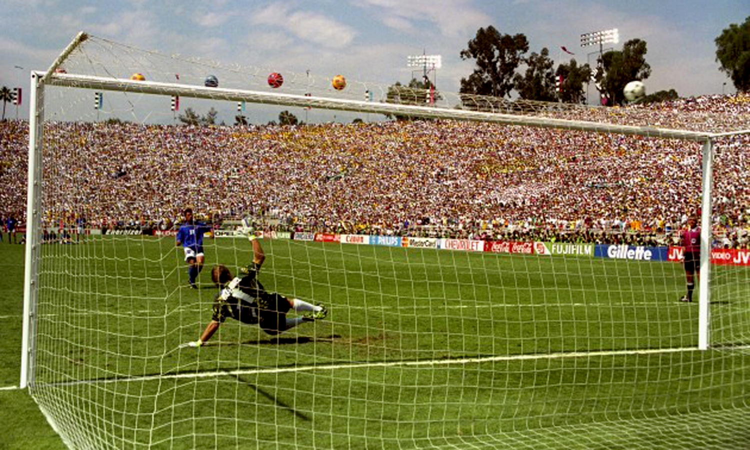 বেদনার রঙ নীল। ইতালির জার্সি নীল। কাকতাল? মোটেই নয়! ১৯৯৪ বিশ্বকাপ ইতালিয়ানদের জন্য অম্লমধুর। স্ট্রাইকার রবার্তো ব্যাজ্জিওর জন্য তারচেয়ে বেশি। পুরো টুর্নামেন্টে দুর্দান্ত ফুটবল খেলে দলকে ফাইনালে তুলেছেন। ৫ গোল করে তৃতীয় বিশ্বকাপ জয়ের দোরগোড়ায় নিয়ে এসেছেন আজ্জুরিদের। কিন্তু, ফাইনালে ট্রাইবেক শ্যুটে পেনাল্টি মিস করে মূহুর্তেই নায়ক থেকে বনে যান খলনায়ক। তার মিসেই নিশ্চিত হয় ব্রাজিলের চতুর্থ বিশ্বকাপ জয়। ১৯৯০ বিশ্বকাপে ইতালিকে তৃতীয় করানোয় রেখেছেন অগ্রণী ভূমিকা। ১৯৯৩ সালে ব্যালন ডি’অর জিতেছেন, ‘৯৪তে হয়েছেন ২য়। বিশ্বকাপে ব্যাজ্জিওর উপর তাই নজর ছিল সবার। ক্যারিয়ারের মধ্যগগণে থেকেও অল্পের জন্য দেশকে সোনার সম্মান এনে দিতে পারেননি, আসরে সিলভার বুট পেলেও রবার্তোর তাই পাওয়া হয়নি অমরত্ব।
