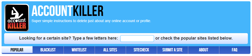 আমাদের অনেক সময় বিশেষ প্রয়োজনে অনেকগুলো সোশ্যাল মিডিয়ার অ্যাকাউন্ট খুলতে হয়, পরে এইগুলো ডিলিট করতে অনেক ঝামেলা পোয়াতে হয়। এই সমস্যার সমাধান সহজে করে দিবে এই সাইটটি। আপনি আপনার সব ধরনের সোশ্যাল মিডিয়া অ্যাকাউন্ট ডিলেট করতে পারবেন নিমিশেই। সাইটটি আপনার গোপনীয়তা রক্ষা করবে। ২০১১ সালে তৈরি করা হয় এই সাইটটি।