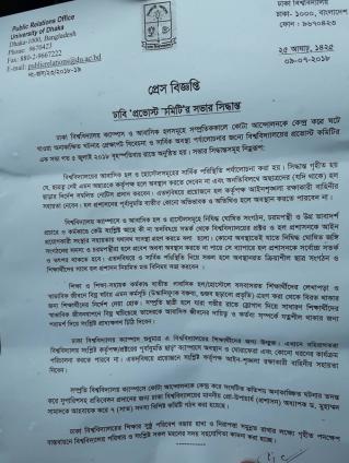 বিশ্ববিদ্যালয়ের জনসংযোগ দফতরের ভারপ্রাপ্ত পরিচালক স্বাক্ষরিত বিবৃতিতে বিশ্ববিদ্যালয়ের শিক্ষার সুষ্ঠু পরিবেশ বজায় রাখা ও নিরাপত্তা সমুন্নত রাখতে গৃহীত পদক্ষেপ বাস্তবায়নে সব মহলের সহযোগিতা চাওয়া হয়েছে।